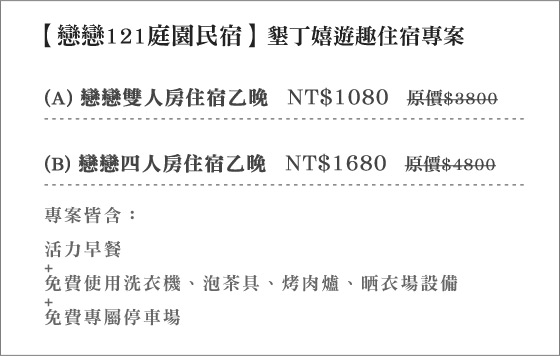 商品訊息簡述: 只要1080元起即可享【戀戀121庭園民宿】原價最高4800元墾丁嬉遊趣住宿專案:(A)戀戀雙人房住宿乙晚/(B)戀戀奶H房住宿乙晚,專案皆含:活力早餐+免費使用洗衣機、泡茶具、烤肉爐、晒衣場設備+免費專屬停車場。
